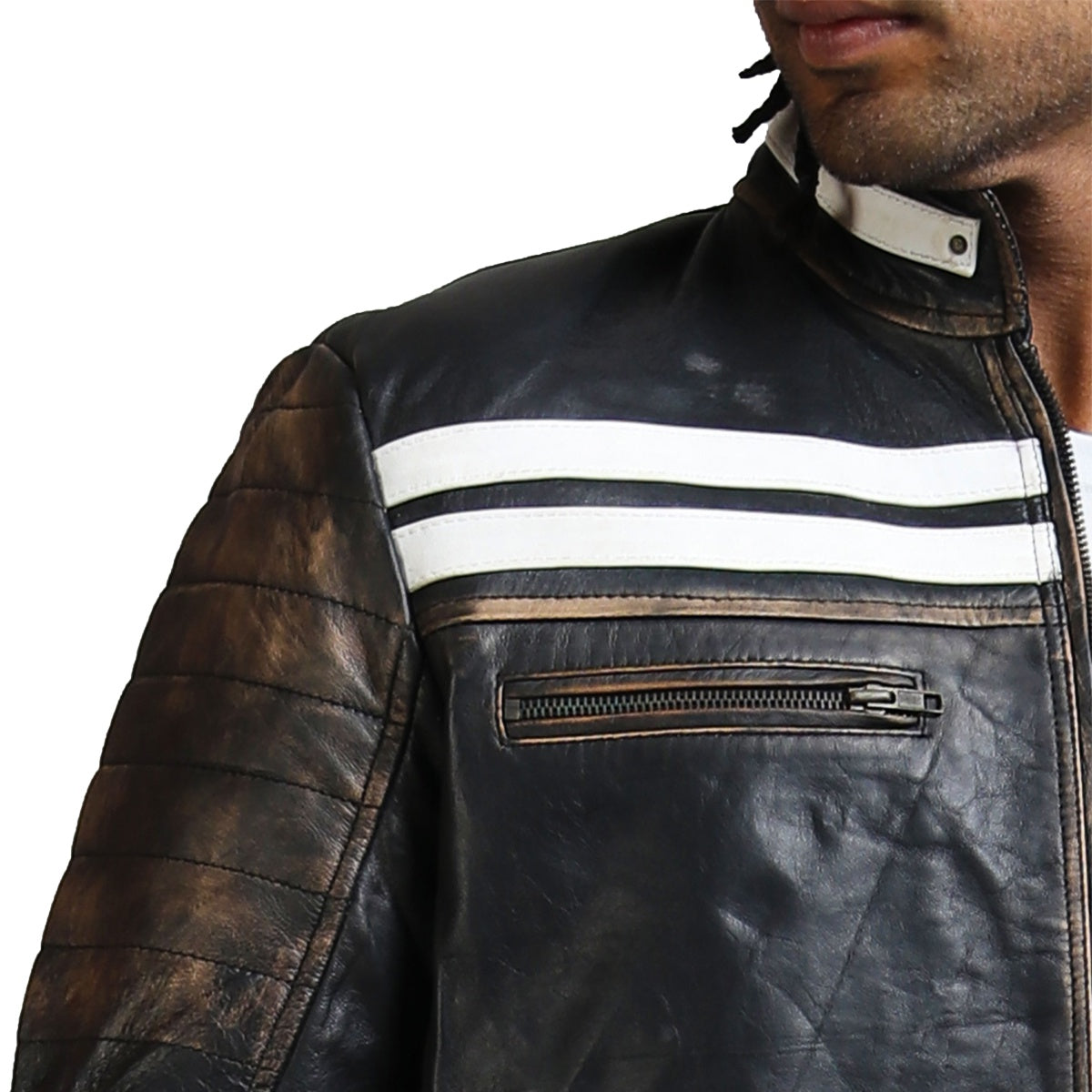 Black Genuine Leather Distressed Biker Jacket With White Stripes